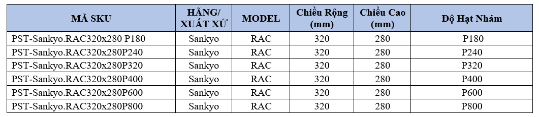 Giấy nhám tờ khô Sankyo RAC là loại giấy nhám được sử dụng trong môi trường khô, là loại giấy có chất lượng tốt mà lại đi kèm với giá cả phải chăng. Sản phẩm có khả năng giúp đánh bóng các bề mặt như tường, sắt, gỗ, cũng như loại bỏ bỏ những vết xước nhỏ, mang lại vẻ bóng sáng của vật liệu nhằm nâng cao giá trị thẩm mỹ của sản phẩm. Sản phẩm có độ bền cao và có thể chà được bề mặt có diện tích lớn, điều này mang lại hiệu quả cao trong quá trình chà nhám.